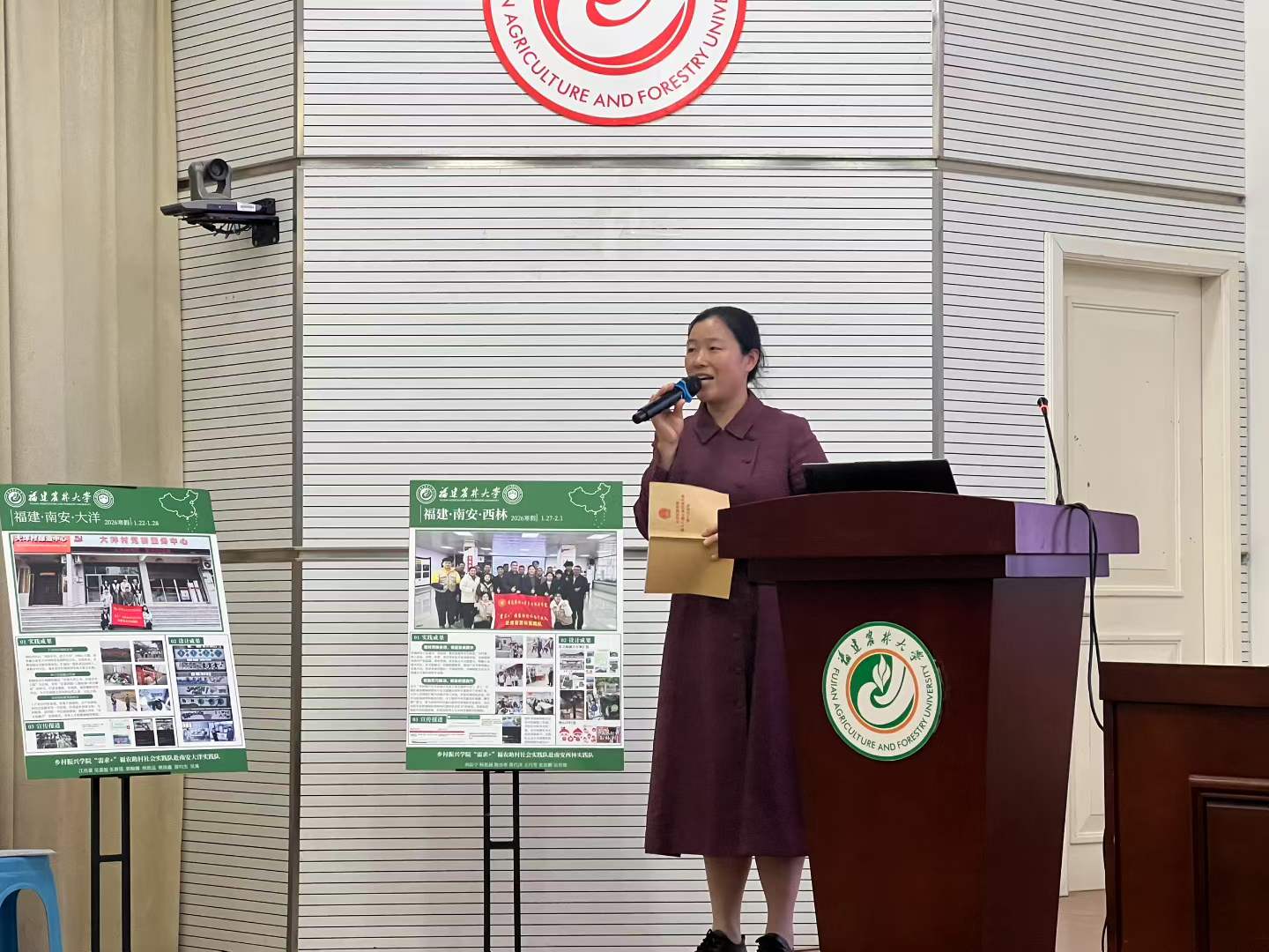 陳玲鳳為活動(dòng)作總結(jié)講話。她強(qiáng)調(diào),學(xué)院發(fā)起并持續(xù)深化“需求+”定制化三下鄉(xiāng)行動(dòng),正是以實(shí)際行動(dòng)踐行習(xí)近平總書記給福建農(nóng)林大學(xué)重要回信精神,把課堂所學(xué)、青年所長與鄉(xiāng)村需求緊密結(jié)合,走出了一條特色鮮明、實(shí)效突出的大學(xué)生服務(wù)鄉(xiāng)村振興的新路子”,她寄語同學(xué)們,要復(fù)盤實(shí)踐、沉淀收獲;要錘煉意志、精進(jìn)本領(lǐng);要扎根基層、矢志奮斗,在鄉(xiāng)村大地書寫建功立業(yè)新篇章。隨后,黃珍華公布獲獎(jiǎng)名單,陳玲鳳為獲獎(jiǎng)團(tuán)隊(duì)和個(gè)人頒獎(jiǎng)。合影環(huán)節(jié),報(bào)告廳內(nèi)歡聲笑語不斷,為本次實(shí)踐畫上圓滿句號(hào),也吹響了新一年社會(huì)實(shí)踐的沖鋒號(hào)。