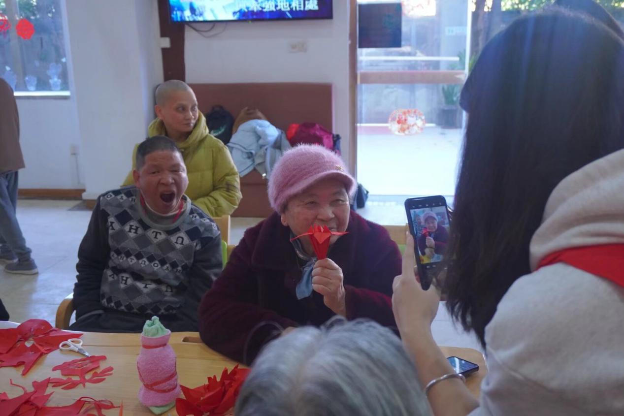 志愿者教老人們剪紙