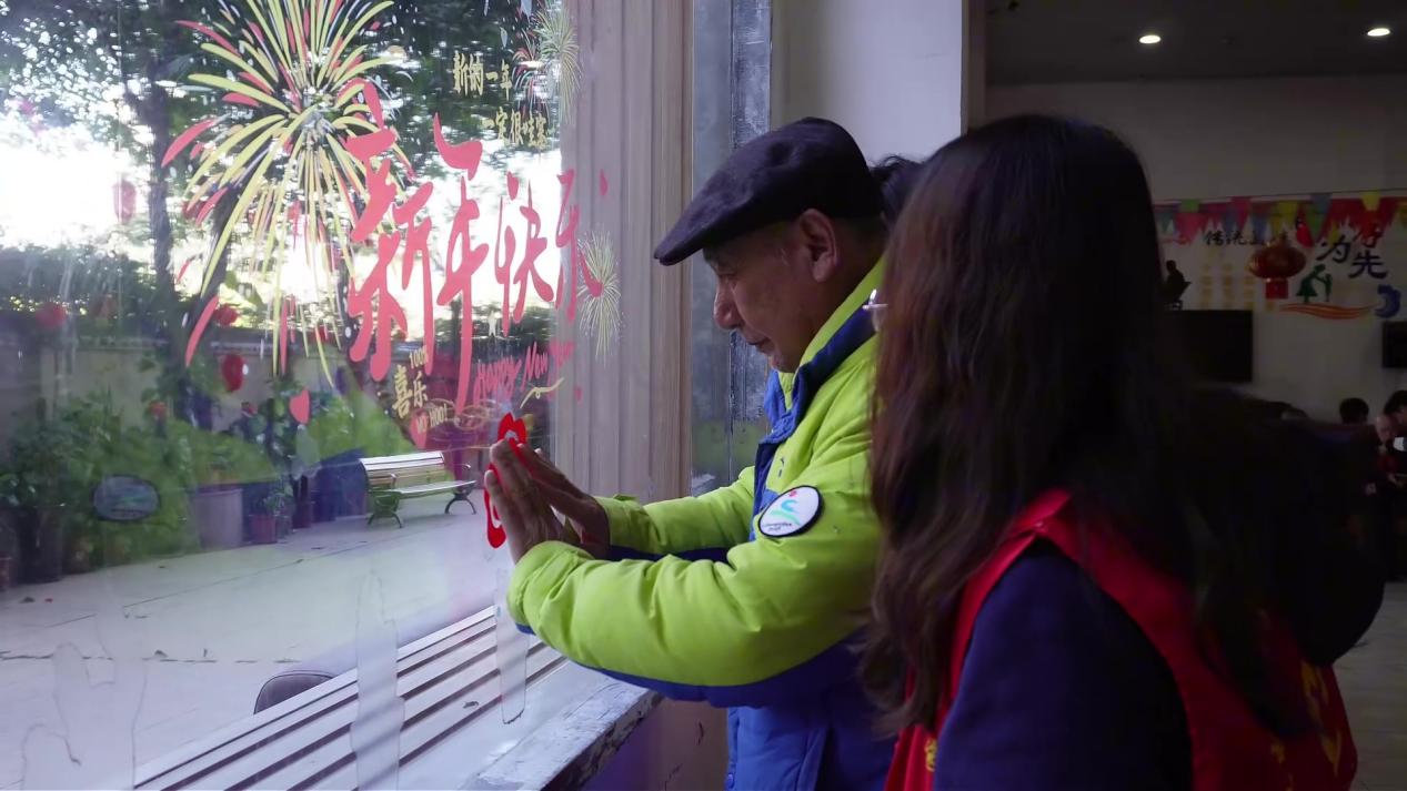志愿者和老人們一起貼窗花
